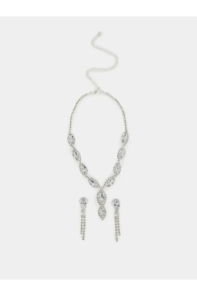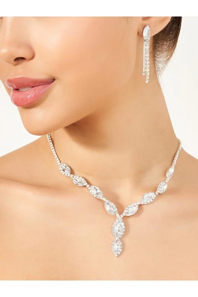 - طقم متكامل يتكون من عقد وأقراط لامعة، مما يضفي لمسة من الفخامة على مظهرك.