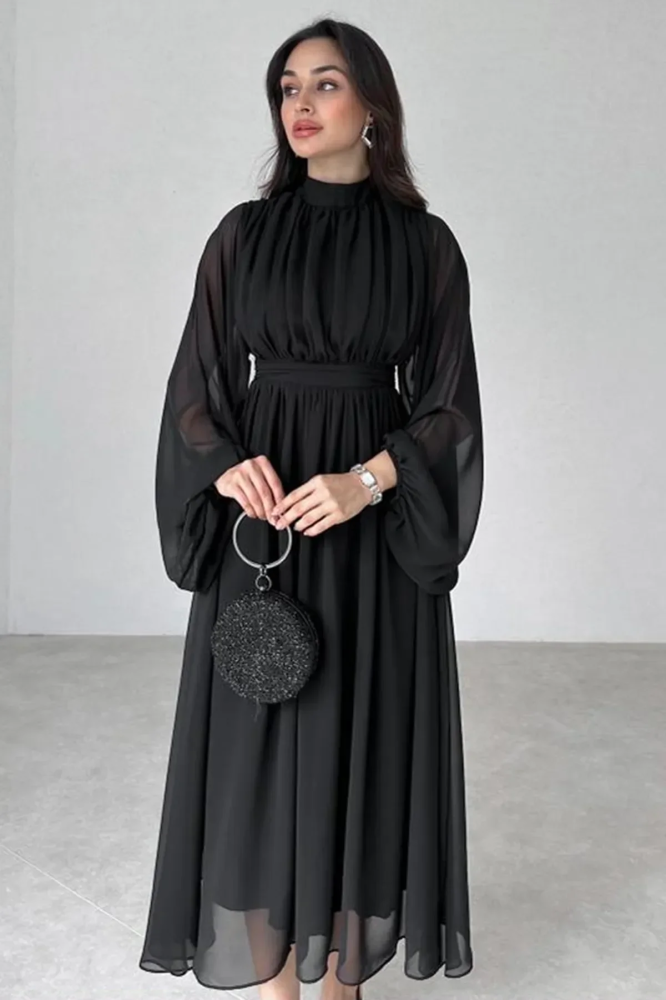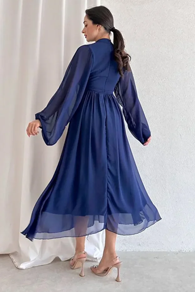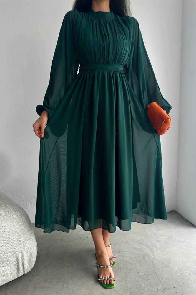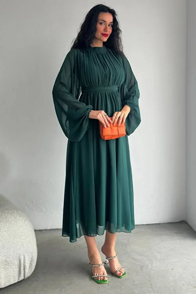 فستان شيفون زمردي واسع بياقة قائمة وأكمام طويلة