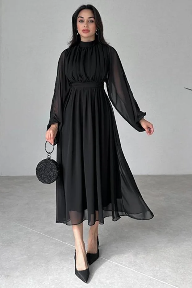 • الاسم: فستان شيفون زمردي واسع بياقة قائمة وأكمام طويلة