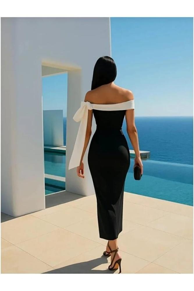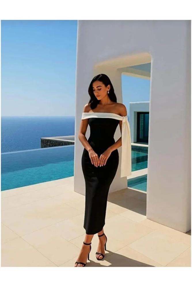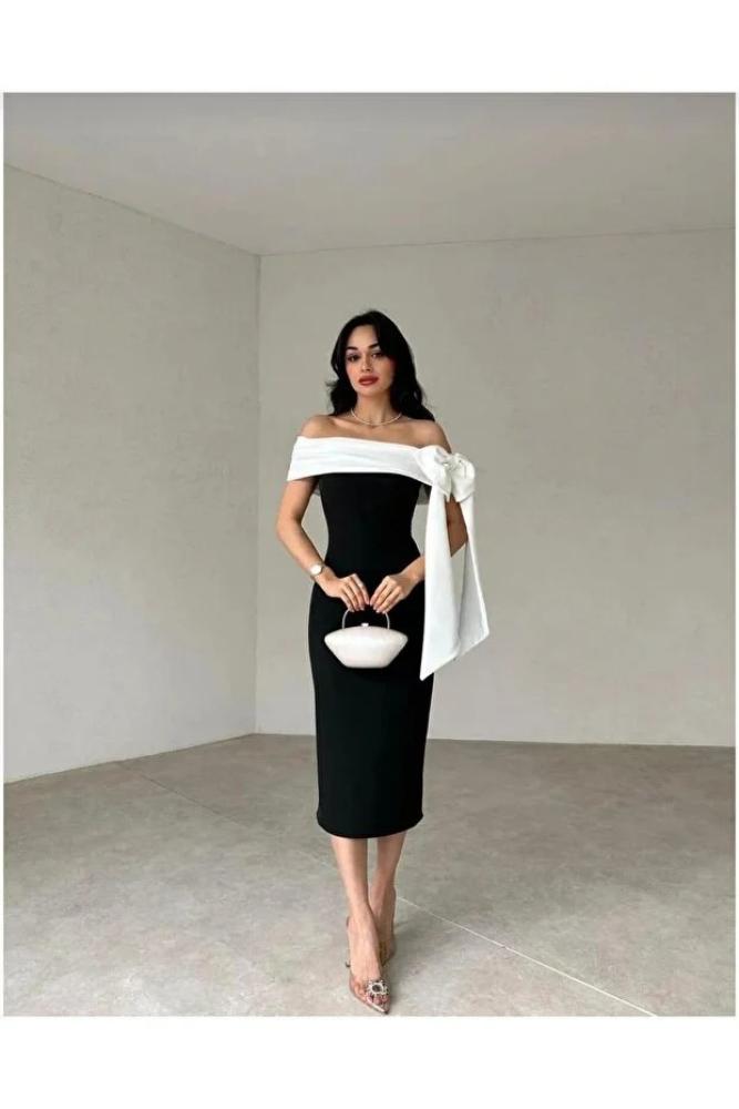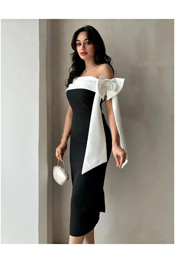 - الاسم: فستان الكريب باللونين الأبيض والأسود من إيزرا