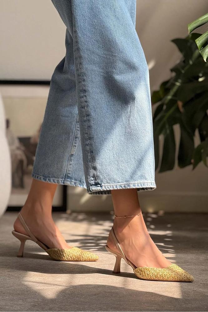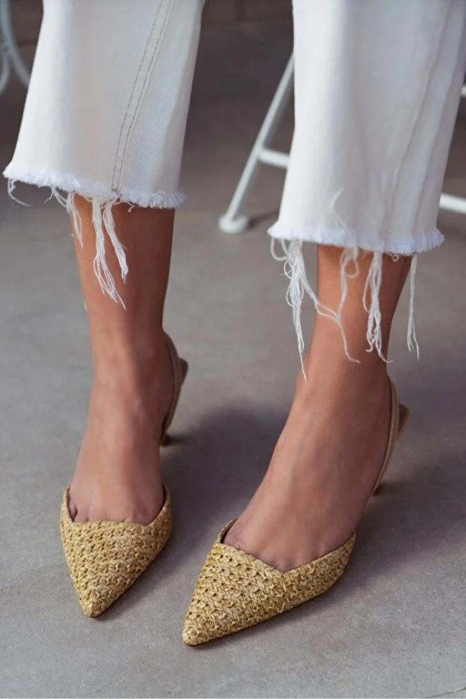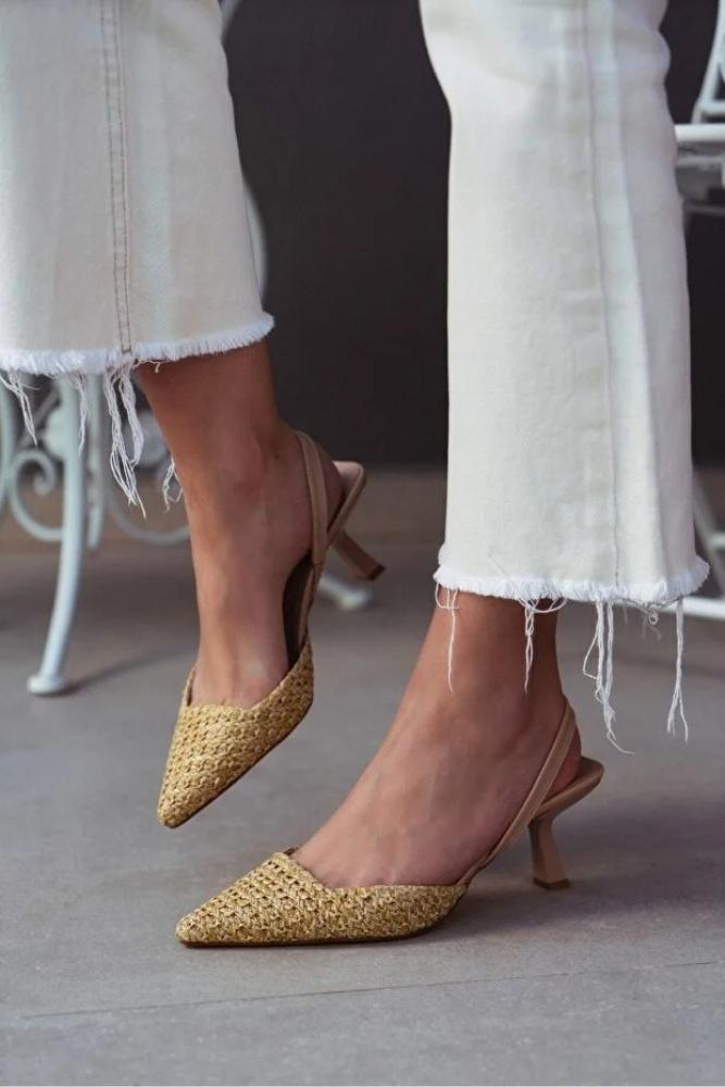 - اسم المنتج: حذاء كعب عالى رفيع بوني نسائي ومقدمة مدببة من القش