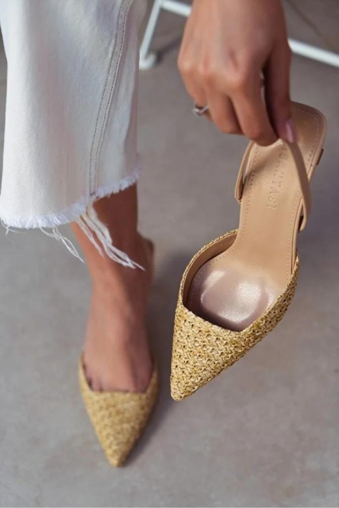 حذاء كعب عالي رفيع بوني النسائي مقدمة مدببة من القش باللون البيج هو الخيار المثالي لمظهرك الأنيق والعصري. بتصميمه الفريد من نوعه والمقدمة المدببة، يجمع هذا الحذاء بين الراحة والأناقة ليكون قطعة أساسية في خزانة ملابسك.